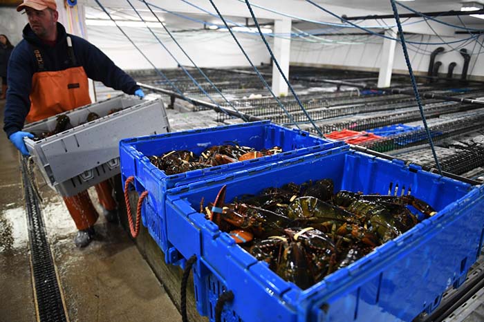 3月29日,在美国缅因州波特兰附近的海岸龙虾公司,一名工人搬运龙虾。