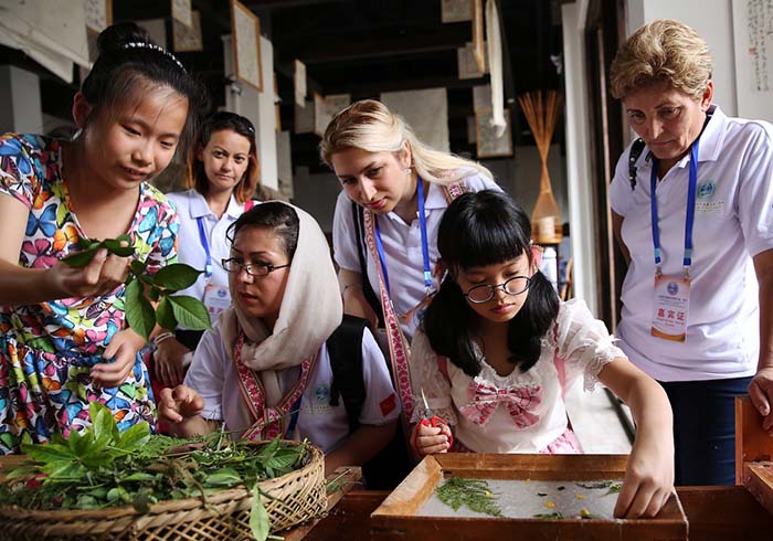 2017年8月15日,“魅力非遗——第二届上海合作组织夏令营·非物质文化遗产交流体验”活动在贵州省黔东南苗族侗族自治州丹寨县万达小镇举行。这是外国手工艺人在古法造纸体验馆了解花草纸的制作过程。 新华社发(黄晓海 摄)