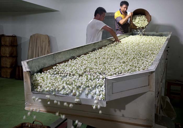 8月21日,制茶师傅在福州城门镇龙江村南仙制茶车间筛选茉莉花。 新华社记者林善传 摄