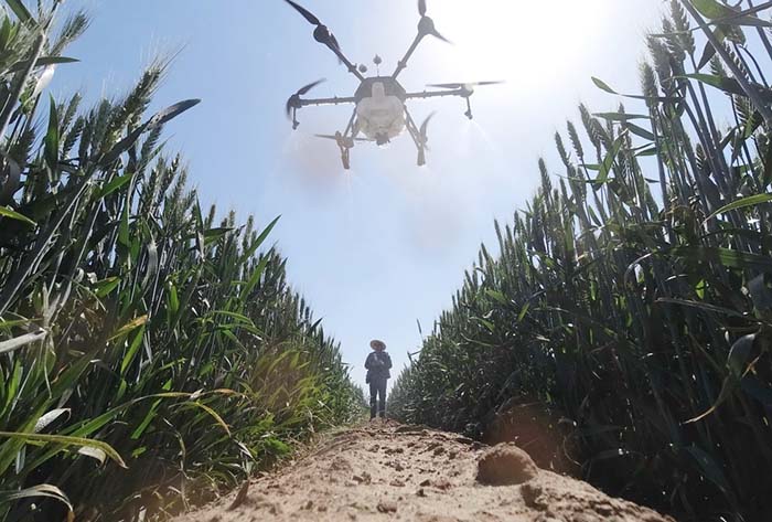 5月13日,河北省滦州市东安各庄镇一农业合作社的社员操作植保无人机在麦田里作业。