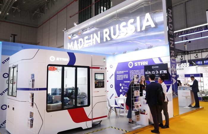 11月7日,参观者在第六届进博会技术装备展区的俄罗斯企业联合展台与展方工作人员交流。