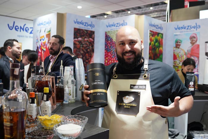 11月7日,展商在第六届进博会国家展委内瑞拉展台展示朗姆酒。 新华社记者李梦娇 摄