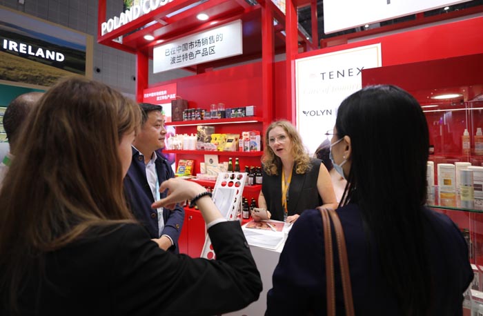 11月6日,在第六届进博会国家展波兰展台,参观者向展商咨询展品细节。 新华社记者李梦娇 摄