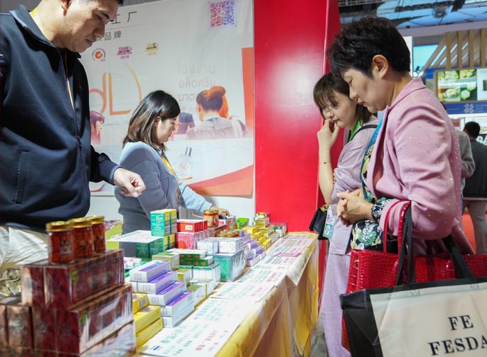11月7日,在第六届进博会消费品展区,泰国参观者在咨询来自泰国的产品信息。 新华社记者丁汀 摄