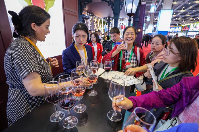 11月6日,参观者在第六届进博会国家展格鲁吉亚展台品尝格鲁吉亚红酒。 新华社记者辛梦晨 摄