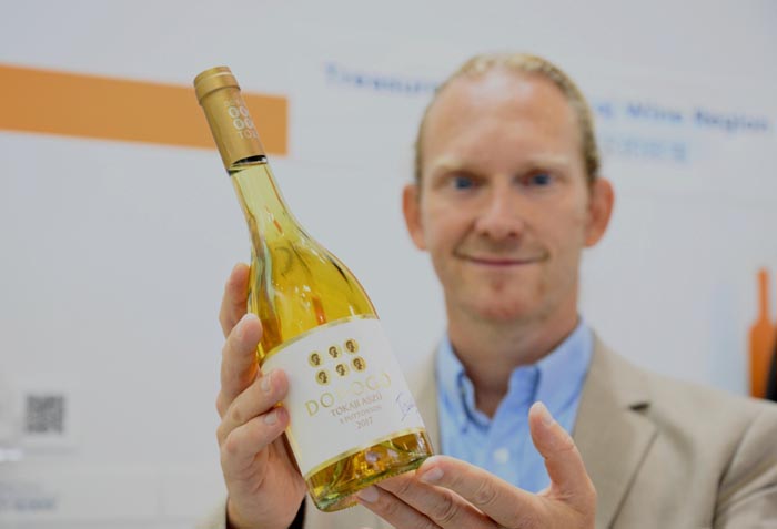 9月8日,来自匈牙利的酒商邵剥洋在展示匈牙利托卡伊葡萄酒产区出品的贵腐酒。 新华社记者魏培全 摄