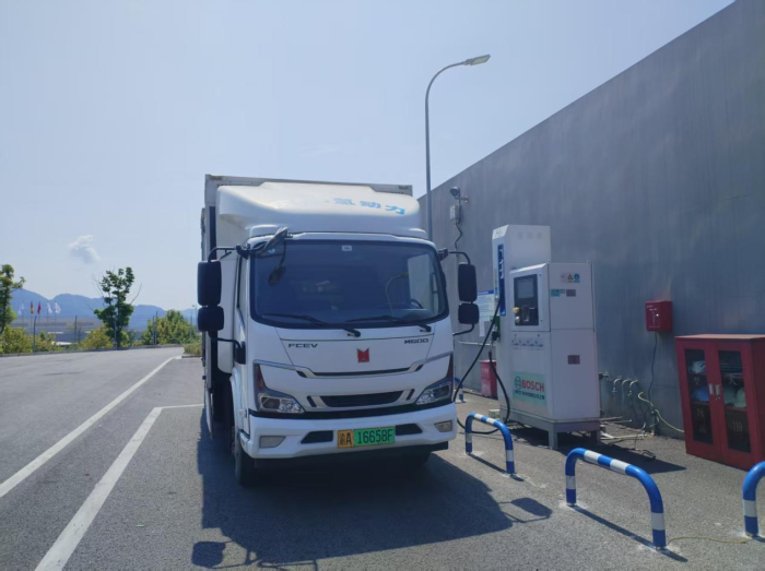 一辆庆铃氢燃料电池车在加氢。(相玉婷摄)