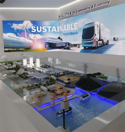 在博世氢动力系统(重庆)有限公司展厅内,高级政府关系经理刘颖妮站在氢能应用模型前,向来访者介绍道:“在我们的规划中,风电、水电、光伏等绿电将通过电解槽制氢厂转化为绿氢,再经由管道或车辆运输至炼钢厂及飞机、轮船、商用车等大交通应用场景。我们坚信,氢能将成为人类社会的终极能源,为未来发展提供坚实支撑。”