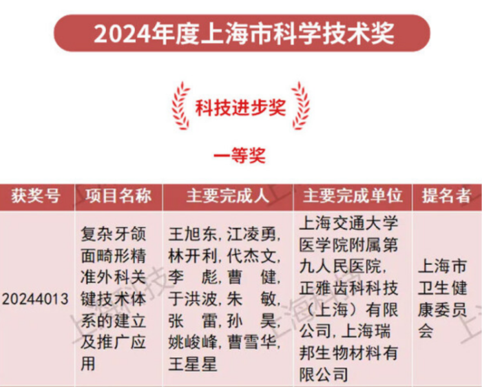 8月26日,2024年度上海市科学技术奖励大会召开,揭晓了2024年度上海市科学技术奖。由上海交通大学医学院附属第九人民医院作为第一完成人、正雅齿科科技(上海)有限公司作为第二完成人,其合作项目"复杂牙颌面畸形精准外科关键技术体系的建立及推广应用"获上海市科技进步奖一等奖。本项目是产学研深度合作的创新标杆。它成功融合了上海九院口腔颅颌面科在复杂牙颌面畸形领域的顶尖临床技术、与正雅公司领先的数字化软件模拟与智能生产能力,携手为复杂牙颌面畸形患者开启了优质的诊疗新体验。