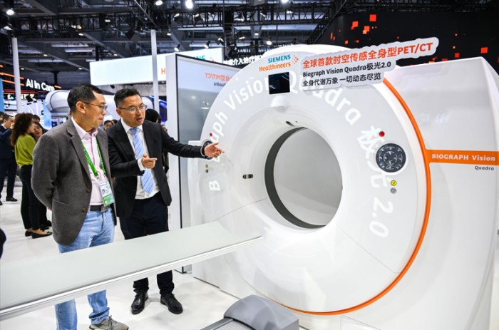 西门子展区,参展商正向观众介绍全球首款时空传感全身型PET_CT仪器。(魏尧摄)