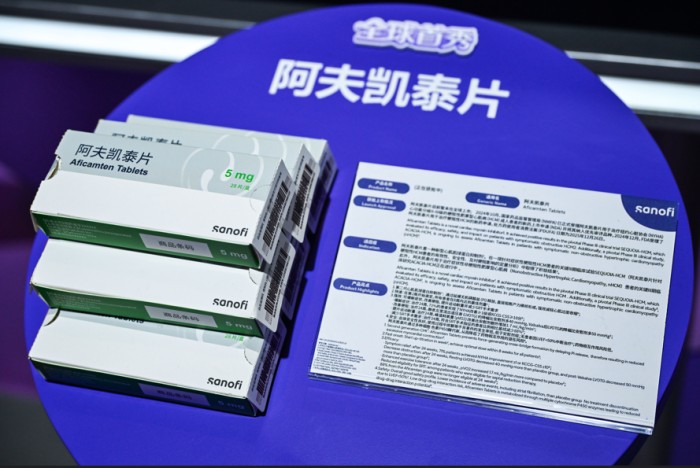 赛诺菲Sanofi展台展示的全球首秀药品阿夫凯泰片Aficamten。(魏尧摄)
