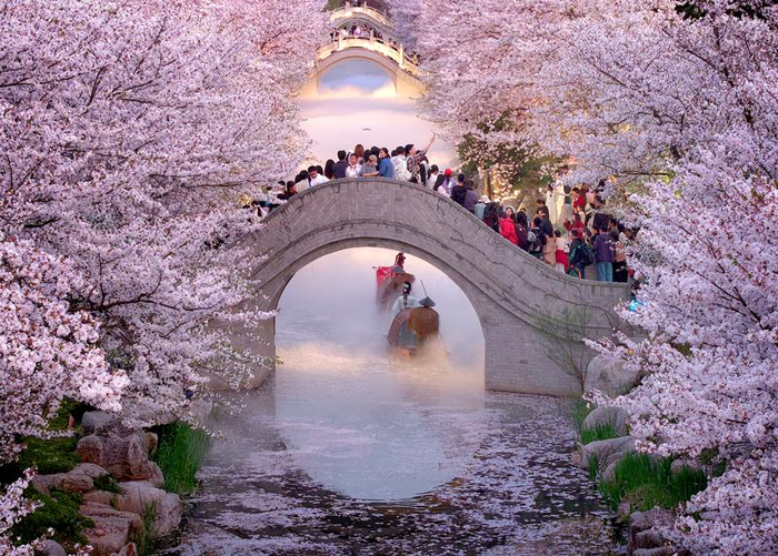 4月5日,游客在江苏南通洲际梦幻岛欣赏樱花河(无人机照片)。新华社发(许丛军 摄)