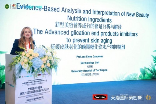 罗马第二大学皮肤实验室负责人Elena Campione教授从“成分支撑”角度带来国际视角的观点,以《美容营养新成分循证分析与解读》为例,印证美容营养已进入“循证时代”,并重点介绍了α-硫辛酸、肉桂提取物、铬等多种抑制AGEs的活性成分,以及麦角硫因的抗衰老机制与证据。