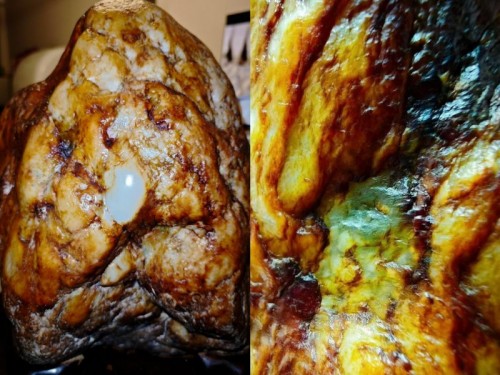 本届展会的最大亮点,是一颗重达48.6公斤、被誉为“昆仑仙桃”的罕见和田红糖皮旱籽料的震撼亮相。这颗原石汇聚十一大稀有特征于一身:满色枣红皮,浓郁均匀;属旱籽料(水返沙),兼具籽料质地与戈壁风蚀特征;玉肉达一级白,细腻纯净;带翠色,青绿隐约;表面纯天然碱壳;清晰风化纹;附红糖皮,红褐沁染;整体形如“大寿桃”,形态饱满;轮廓亦如昆仑山脉,巍峨凝重;玉质油润度极佳,触之手感如脂;更罕见的是同时具备木火土金水“五行五色”:翠为木、红为火、黄为土、白为金、墨如水,暗合中国传统哲学意蕴,象征圆满与共生。