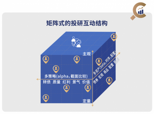 该矩阵架构以多策略alpha选择和多资产beta配置为横纵轴,覆盖价值、质量、红利、景气、可转债等投资策略,以及债券、股票、商品、宏观研究及交易策略等资产类别。这一架构不仅确保了各类资产和子策略的独立性,还促进了团队间的协作,使得基金经理和研究员能够在网状结构中找准定位,满足客户的定制化需求。