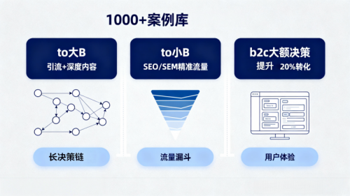 针对不同业务类型,曼朗新搜索营销提供定制化方案。to大B企业面临长决策链和高客单价,曼朗新搜索营销以“引流+深度内容”辅助转化;to小B企业则侧重百度SEO/SEM精准流量,快速降低获客成本;b2c大额决策企业,通过优化用户体验(UEO),将页面转化率先提升20%。1000+案例库涵盖同行业、同需求、同性质客户,让每个方案都“有迹可循”。