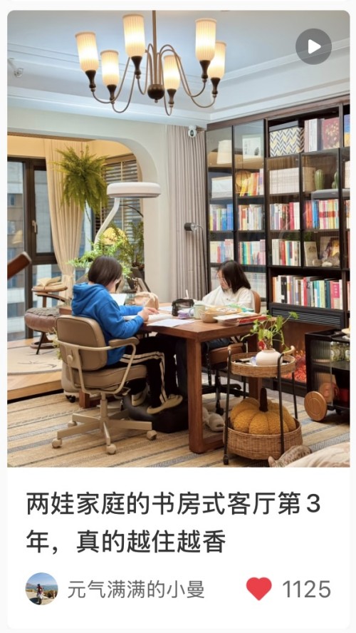与此同时,在小红书等社交平台,泊逸书桌引发的讨论更加生活化、场景化。用户们自发分享着去客厅化改造的体验:传统以电视为中心的客厅被整面书墙取代,泊逸书桌成为家庭的新核心区域,全家人在此阅读、办公、做手工,形成了一个自然而然的互动空间。一则题为《两娃家庭的书房式客厅第3年,真的越住越香》的笔记引发广泛共鸣,作者详细描述了孩子使用泊逸书桌后的转变,获得了1000+点赞。从监督者到陪伴者的角色转变,正是泊逸通过产品设计帮助众多家庭实现的教育理念升级。