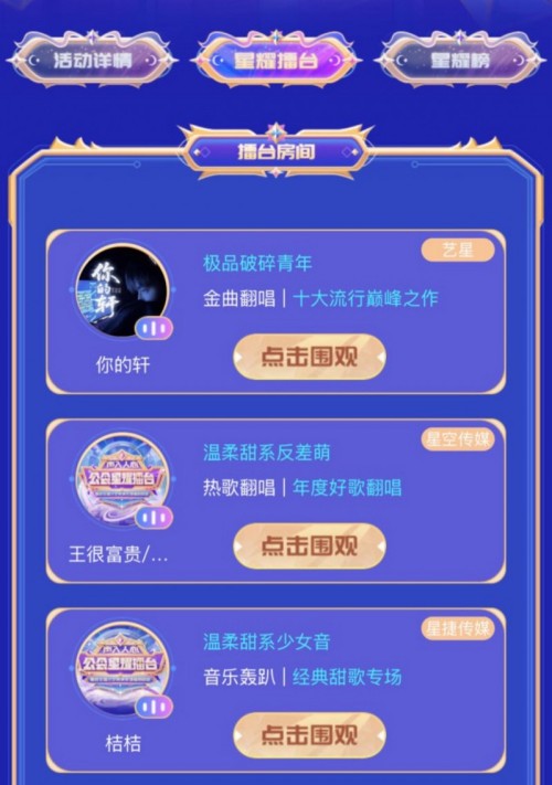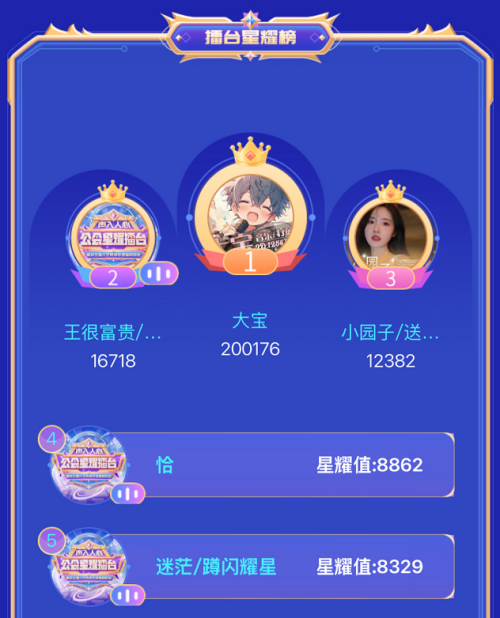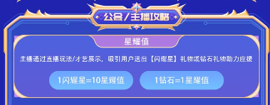 对于参与活动的主播和公会来说,星耀值可是争夺奖励的关键!主播通过精彩的直播玩法和惊艳的才艺展示,吸引用户送出闪耀星或钻石礼物助力,1个闪耀星可兑换10星耀值,1钻石可兑换1星耀值,每一份支持都能为星耀值加分!