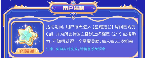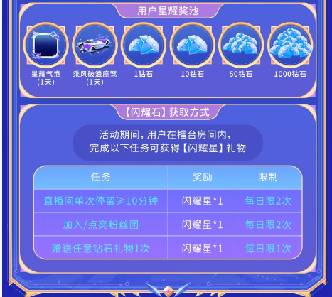 想为喜欢的主播送上更多应援?那就赶紧get闪耀星获取方法!在擂台房间内完成简单任务就能轻松领取:直播间单次停留≥10分钟,沉浸式感受主播魅力,就能获得闪耀星1,每日限2次;加入或点亮主播粉丝团,和志同道合的伙伴一起为热爱打Call,可获得闪耀星1,每日限2次;给主播赠送任意钻石礼物1次,传递你的支持与喜爱,还能获得闪耀星*1,每日限1次。简单几步,就能积攒更多闪耀星,为心仪主播助力更轻松!