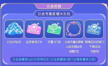 公会奖励:星耀值排名top1的公会,可获得专属星耀大礼包,包含15000钻石、品类推荐7次、流量卡7张、公会专属头像框(公会所有主播可佩戴7天)、特殊房间名额*2(下期活动可使用),助力公会发展更上一层楼(公会星耀值为旗下所有主播星耀值之和)。