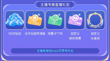 主播奖励:主播星耀值排名top1的主播,能拿到主播专属星耀礼包,包含5000钻石、全平台宣传弹窗、流量卡*7天、自定义房间背景、自定义头像框,让主播收获更多关注与认可!