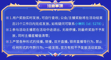 需要注意的是,用户获得的奖励实时发放,可自行查收;公会和主播的奖励将在活动结束后15个工作日内完成发放,如有疑问,可联系小喇叭(id: 5278)咨询。参与活动的主播若在活动中途退出、无故停播,最终奖励将不予发放,同时主播星耀值清零;另外,严禁挂播、替播、双开直播、锁房直播等行为,禁止任何形式的作弊行为,一经发现,官方有权不予发放活动奖励,大家一定要遵守规则,共同维护良好的活动氛围!