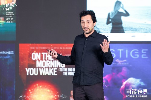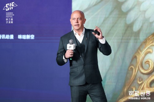 在未来叙事峰会的主题演讲环节,艾美奖评委、砂之盒沉浸展联合发起人Eric Shamlin首先以「AI驱动下的新娱乐内容创作」为题,分享了他对于如何将AI应用于内容创作的观点。