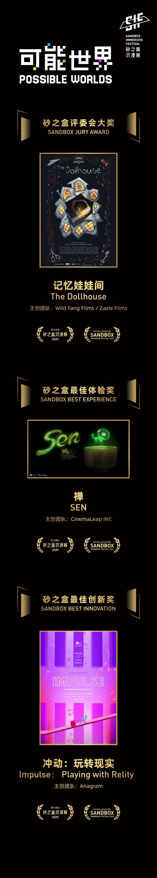 在今天的「砂之盒颁奖礼」环节,2025砂之盒沉浸展的竞赛单元评选结果最终揭晓!