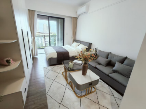 房间内配置齐全,独立厨房配备抽油烟机、冰箱及收纳橱柜,支持简餐烹饪;五星级床垫、封闭式阳台、全自动洗衣机与可伸缩晾衣架,兼顾舒适与实用。同时,每户均设有小型工作学习区,书桌与沙发合理搭配,适应居家办公与休闲场景。
