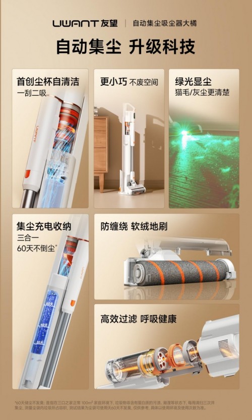 友望大橘的自集尘基站,吸完地放回去就能自动抽尘,2L 尘袋满了直接密封扔掉,不用碰灰;滚刷自带防缠毛结构,长发、猫毛吸进去不会缠成团,不用每周拆剪;滤网是可替换 HEPA,2 个月换一次就行,不用像其他机型那样水洗晾干。杭州租房党小吴说:“我每天加班到 9 点,以前用扫帚扫完还得擦,现在用友望大橘,10 分钟吸完放回去,不用管倒尘、剪毛,太适合我这种‘怕麻烦星人’了。”