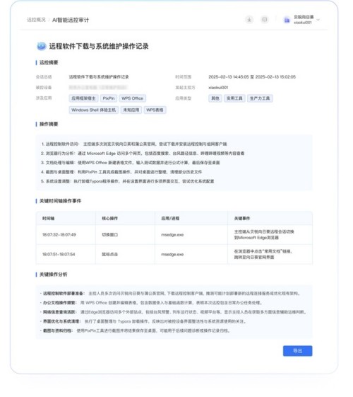 结合屏幕墙与AI脚本功能,企业可快速发现并处理故障;而AI智能审计功能可对远控全过程进行分析并自动生成报告,帮助管理者高效完成复盘与合规审计,全面提升运维质量与透明度。
