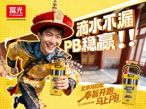 专业的防护为跑者筑牢了外部基础,而持久的续航则更依赖于体内的能量平衡,面对42.195公里的极限考验,水分管理直接关系到每一位跑者的表现与状态。为此,富光还在参赛包里配备了北京城市限定款“富光PB杯”,PB杯杯身披覆昂扬的明黄色,“奉旨开跑,马上PB”的标语跃然其上,既点明这场赛事是“官方认证”的顶级赛事,也以跑步圈熟知的“PB”术语传递出北马“挑战自我、超越极限、坚韧不拔”的竞技精神。
