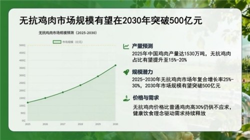 从行业来看,博研咨询发布的《2025-2030 年中国无抗养殖行业市场规模及投资前景预测分析报告》显示,无抗鸡肉市场规模有望在2030年突破500亿元,引领健康肉品消费崛起。
