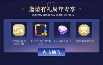 本次活动为推荐官及受邀新用户准备了专属福利,诚意满满!只要参与活动,就有机会抽取丰厚奖励,助力你的王者征程更出彩!成功参与即有机会解锁5折皮肤基金(50Q币),让你以更划算的价格入手心仪皮肤;还有打十个公屏气泡框7天、Hello钻石×10等你来拿,更有宝贵的一次免单抽奖机会,运气爆棚就能享受皮肤免单福利!参与方式超简单,点击“抽取”按钮就能开启专属福利之旅!