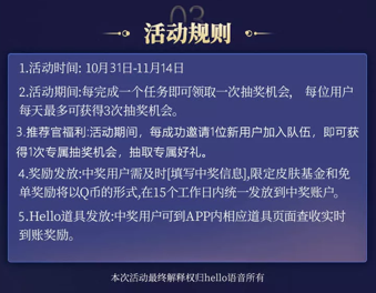 关于奖励发放,中奖用户需及时填写中奖信息,限定皮肤基金和免单奖励将以Q币形式,在15个工作日内统一发放到中奖账户;Hello道具中奖后可直接到APP内相应道具页面查收,实时到账超省心!本次活动最终解释权归Hello语音所有。