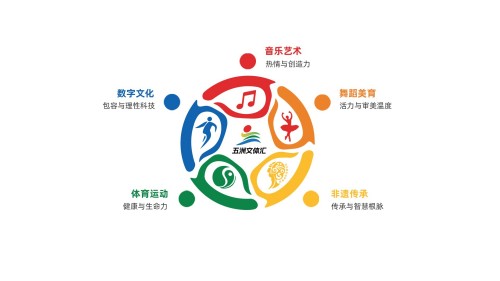 新LOGO以圆形为主视觉结构,寓意“汇聚、循环与共融”,象征五洲文化的联动与和谐。标志由五种代表色构成,红、橙、黄、绿、蓝分别对应音乐艺术、舞蹈美育、非遗传承、体育运动与数字文化,体现了五洲文体汇“文化共建·全民共享”的服务理念。中心抽象人物造型向上跃动,诠释“乐活、向上、共融”的品牌精神。