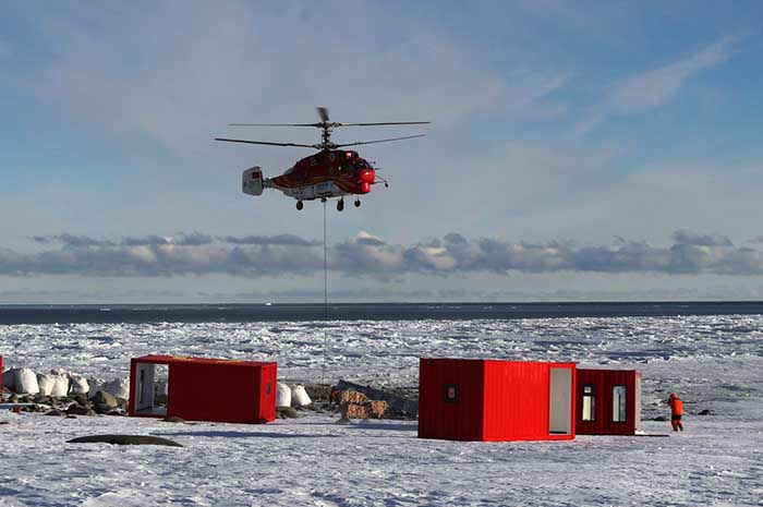12月9日,船载“雪鹰12”Ka-32直升机将物资吊运至恩克斯堡岛新建站区。 新华社记者白国龙 摄