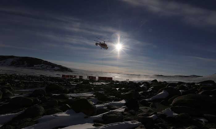 12月9日,船载“雪鹰12”Ka-32直升机将物资吊运至恩克斯堡岛新建站区。 新华社记者白国龙 摄