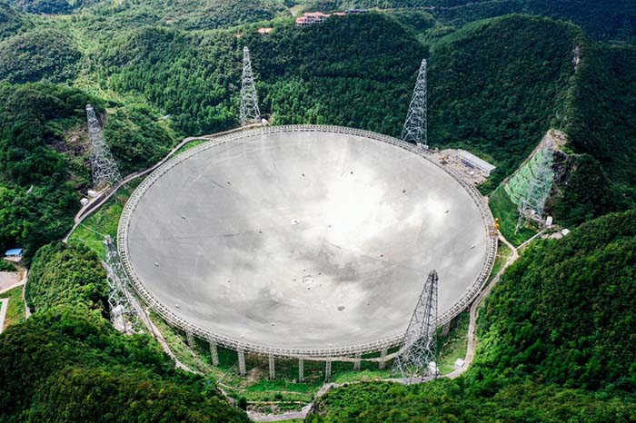2019年8月27日拍摄的“中国天眼”(检修期间拍摄)。经过近三年的紧张调试,“中国天眼”渐入佳境。截至目前,被誉为“中国天眼”的500米口径球面射电望远镜已发现132颗优质的脉冲星候选体,其中有93颗已被确认为新发现的脉冲星。 新华社记者欧东衢 摄