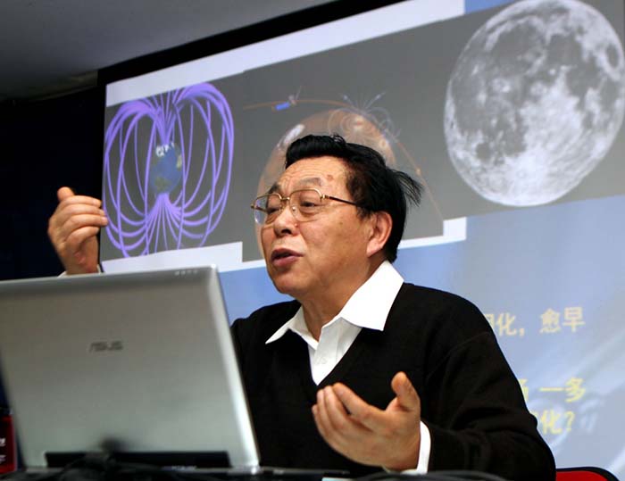 中国月球探测工程首任首席科学家欧阳自远在北京王府井新华书店以“月亮”为主题发表讲演(2010年2月28日摄)。 新华社记者赵琬微 摄