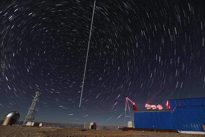 在西藏阿里观测站,“墨子号”量子科学实验卫星过境,科研人员在做实验(2016年12月10日摄,合成照片)。 新华社记者金立旺 摄