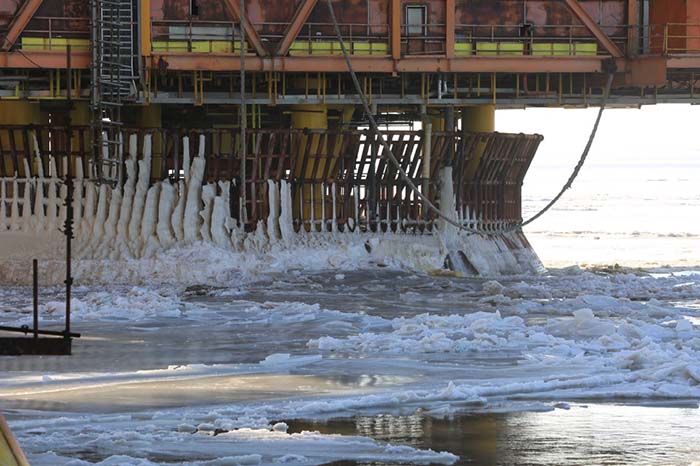 中海油锦州9-3采油平台下浮冰聚集(1月14日摄)。 新华社发(刘青 摄)