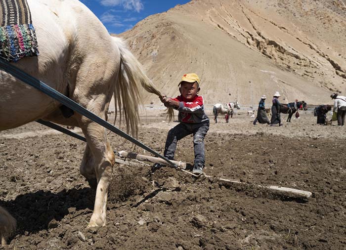 5月4日在西藏扎西宗乡拍摄的小旦多。受疫情影响,他所在的幼儿园还未复课,他便到田里帮父亲犁地。 新华社记者普布扎西 摄
