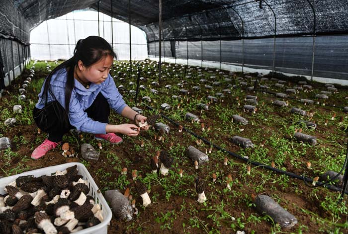 3月16日,员工在大棚里采摘羊肚菌。 新华社发(吴军锋 摄)