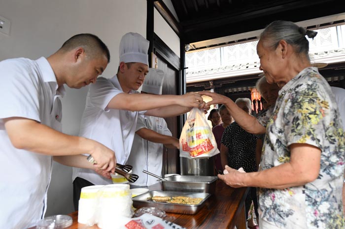 8月27日,在越都社区居家养老服务照料中心,孔乙己酒家的志愿者给来老年食堂用餐的居民发放“爱心餐”。 新华社记者翁忻旸 摄