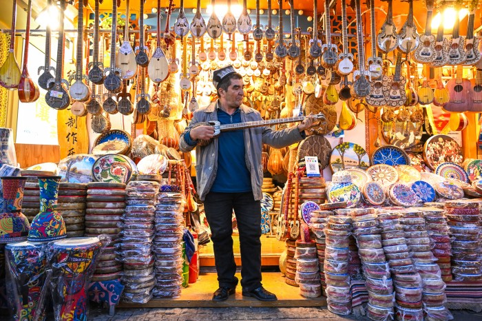 9月23日,在乌鲁木齐国际大巴扎,艾尼江·尤努斯在自家店门口即兴弹奏传统乐器(魏尧摄)