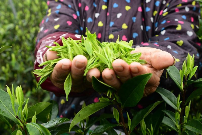 3月28日,在广西河池市罗城仫佬族自治县兼爱乡大竹村白茶基地,采茶工展示采摘的明前茶芽。新华社发(廖光福摄)