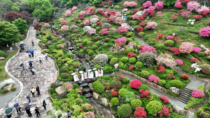 4月11日,游客在浙江省湖州市德清县下渚湖奇幻谷欣赏杜鹃花(无人机照片)。新华社发(谢尚国摄)