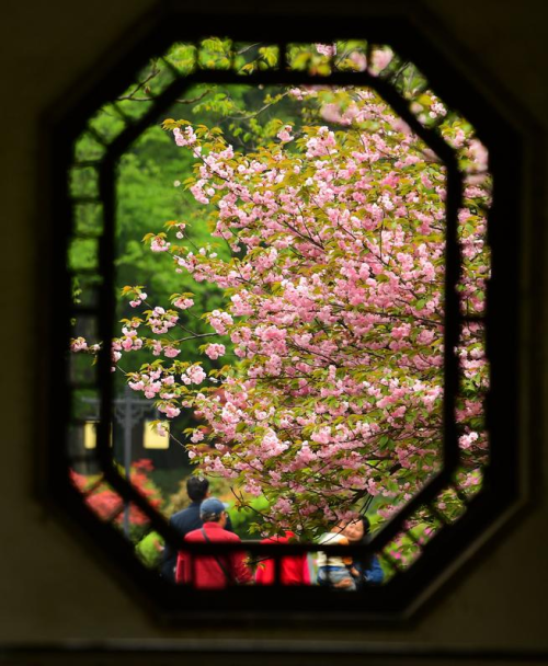 4月11日,游客在江苏无锡吴都路景观带赏景游玩。新华社发(还月亮摄)