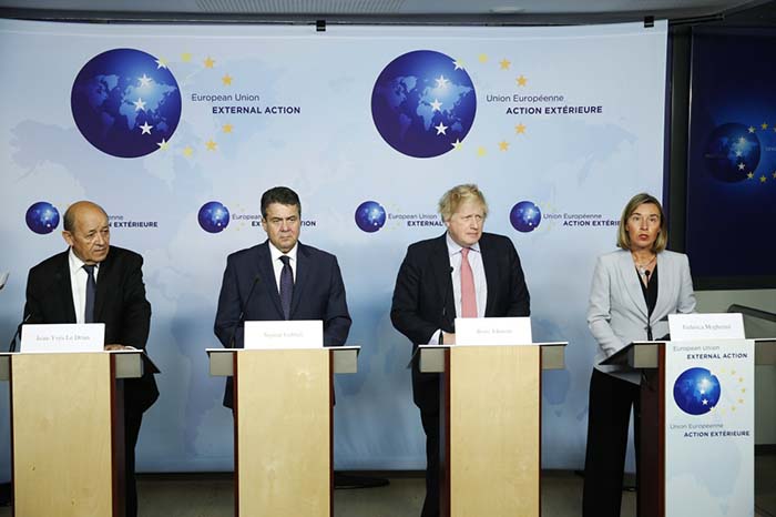 欧盟外交和安全政策高级代表莫盖里尼和法、德、英三国外长11日在布鲁塞尔重申,欧盟及其成员国坚决维护和履行伊朗核问题全面协议。 新华社记者叶平凡 摄